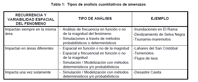 Existen diversos métodos para el análisis de riesgos debidos a amenazas naturales; sin embargo todos plantean una metodología de evaluación que distingue Amenazas y Vulnerabilidades. Entre los métodos que se utilizan están los métodos de análisis cualitativos y cuantitativos. Los métodos cuantitativos pueden aportar, cuando son aplicables, un grado de objetividad superior. Sin embargo, la escasez de datos prohíbe generalmente su aplicación consecuente. Además, para permitir una eficiente gestión del riesgo, es generalmente más importante identificar correctamente las causas profundas (o factores) que causan el riesgo y que influyen sobre su dinámica (es decir sobre su crecimiento o su reducción), tanto del lado de las amenazas como del lado de las vulnerabilidades, que disponer de datos "exactos" sobre los riesgos en sí.