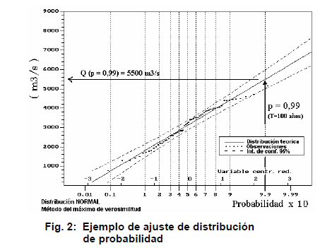 Las distribuciones de probabilidad más comunes en hidrología son de tipo Normal,log-normal, Gumbel, log-Gumbel, y Pearson tipo III. Existen papeles de probabilidad en los cuales las observaciones históricas tienden a alinearse a lo largo de una recta cuando el tipo de distribución corresponde al fenómeno analizado. Cuando el tipo de distribución no es apropiado, los resultados del ajuste no deben utilizarse (debe cambiarse el tipo de papel o de distribución).