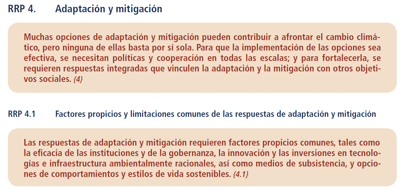 En muchas regiones y sectores, el aumento de la capacidad de mitigación y adaptación es uno de los elementos clave para gestionar los riesgos del cambio climático (nivel de confianza alto). La mejora de las instituciones y de la coordinación y la cooperación en materia de gobernanza pueden ayudar a superar las limitaciones regionales asociadas a la mitigación, la adaptación y la reducción de riesgos de desastre (nivel de confianza muy alto). {4.1}