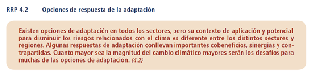Se prevé que la necesidad de adaptación, junto con las dificultades conexas, aumentará con el cambio climático (nivel de confianza muy alto). Existen posibilidades de adaptación en todos los sectores y regiones, con un potencial y enfoques diversos en función de su contexto en relación con la disminución de la vulnerabilidad, la gestión de riesgos de desastre o la planificación proactiva de la adaptación (cuadro RRP.3). En las estrategias y las medidas eficaces se contemplan los cobeneficios y las oportunidades posibles en el marco de objetivos estratégicos y planes de desarrollo más amplios. {4.2}