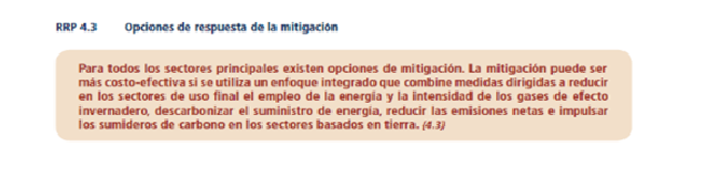 Para reducir las emisiones, resulta más costo-efectivo aplicar estrategias de mitigación sistémicas e intersectoriales bien diseñadas que centrarse en tecnologías y sectores concretos, ya que las medidas en un sector determinan las necesidades de mitigación en otros (nivel de confianza medio). Las medidas de mitigación tienen elementos comunes con otros objetivos sociales, lo que genera posibilidades de cobeneficios o efectos colaterales adversos. Esos elementos comunes, si se gestionan adecuadamente, pueden fortalecer la base para aplicar medidas climáticas. {4.3}