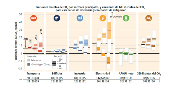 Figura RRP.14 | Emisiones de dióxido de carbono (CO2) y gases de efecto invernadero (GEI) distintos del CO2 (enumerados en el Protocolo de Kyoto) por sector en los escenarios de referencia (barras de color apagado) y en los escenarios de mitigación (barras de color intenso) en los que se llega a concentraciones de aproximadamente 450 (430 a 480) ppm CO2-eq en 2100 (en los que es probable que se limite el calentamiento a 2 °C por encima de los niveles preindustriales). La mitigación en los sectores de uso final provoca también una reducción de las emisiones indirectas en el sector de la generación energética. Por lo tanto, las emisiones directas de los sectores de uso final no incluyen el potencial de reducción de las emisiones del suministro, por ejemplo, debido a la disminución de la demanda de electricidad. Los valores que aparecen en la parte inferior de los gráficos se refieren al número de escenarios incluidos en el rango (fila superior: escenarios de referencia; fila inferior: escenarios de mitigación), que son diferentes en los distintos sectores y escalas temporales debido a la variación de la resolución sectorial y el horizonte temporal de los modelos. Los rangos de las emisiones de los escenarios de mitigación incluyen la cartera completa de opciones de mitigación; muchos modelos no pueden llegar a concentraciones de 450 ppm CO2-eq en 2100 en ausencia de captura y almacenamiento de dióxido de carbono (CAC). Las emisiones negativas del sector eléctrico se deben a la utilización de bioenergía con CAC (BECCS). Las emisiones netas del sector de la agricultura, silvicultura y otros usos del suelo (AFOLU) comprenden las actividades de forestación, reforestación y deforestación. {4.3, figura 4.1}