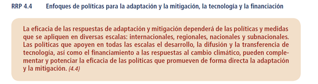 Las políticas que apoyan el desarrollo, la difusión y la transferencia de tecnología complementan otras políticas de mitigación en todas las escalas internacionales a subnacionales; muchos esfuerzos de adaptación también dependen de forma crítica de la difusión y la transferencia de tecnologías y prácticas de gestión (nivel de confianza alto). Existen políticas que abordan los fallos del mercado en investigación y desarrollo, pero el uso efectivo de las tecnologías también puede depender de la capacidad de adoptar tecnologías adecuadas a las circunstancias locales. {4.4.3}