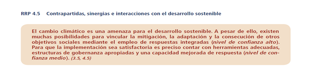 El cambio climático agrava otras amenazas a los sistemas sociales y naturales, colocando nuevas cargas, en particular sobre los pobres (nivel de confianza alto). Armonizar la política climática con el desarrollo sostenible requiere considerar tanto la adaptación como la mitigación (nivel de confianza alto). De demorarse las medidas de mitigación podrían verse limitadas las posibilidades de trayectorias resilientes al clima en el futuro. Las oportunidades para aprovechar las sinergias positivas entre la adaptación y la mitigación pueden reducirse con el tiempo, especialmente si se sobrepasan los límites de la adaptación. Los crecientes esfuerzos desplegados en pro de la mitigación del cambio climático y la adaptación a él van aparejados a una creciente complejidad de las interacciones, especialmente en las intersecciones entre los sectores de la salud humana, el agua, la energía, el uso del suelo y la biodiversidad (evidencia media, nivel de acuerdo alto). {3.1, 3.5, 4.5}