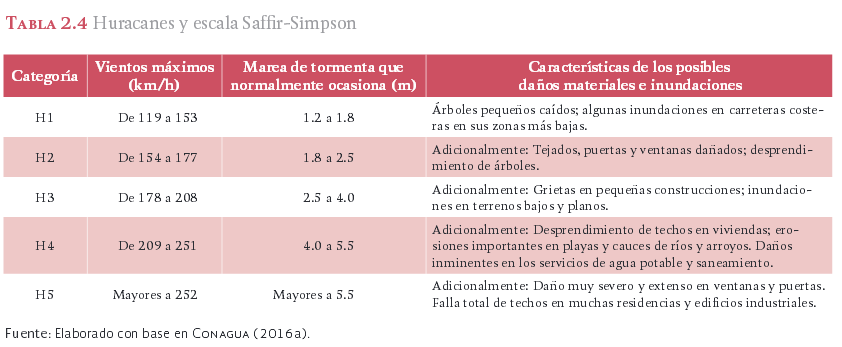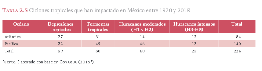 Entre 1970 y 2015 impactaron las costas de México 224 ciclones tropicales. En la tabla 2.5 se presenta su ocurrencia en los océanos Atlántico y Pacífico, donde se observa que han impactado un mayor número de ciclones en el Pacífico.