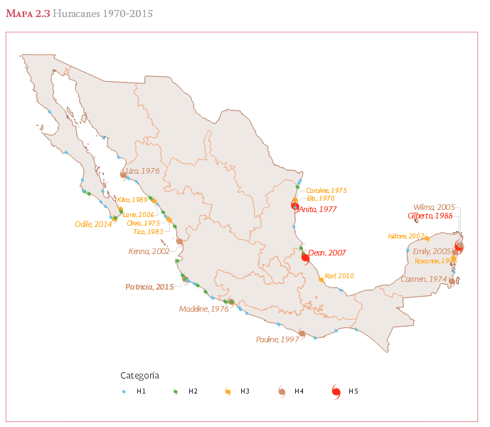 En el mapa 2.3 [Adicional: Tabla 2.B] se presentan los huracanes que se han manifestado en México entre 1970 y 2015. Se identifican con una etiqueta los huracanes intensos (categorías H3-H5) de ese periodo. En la temporada de huracanes 2015, el de mayor categoría que impactó en las costas mexicanas fue Patricia (H4), señalado en negritas.