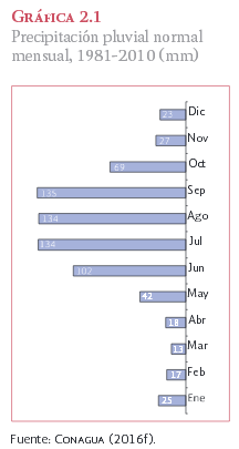 Es importante señalar que la distribución mensual de la precipitación acentúa los problemas relacionados con la disponibilidad del recurso, debido a que el 68% de la precipitación normal mensual ocurre entre, los meses de junio y septiembre, como se observa en la gráfica 2.1.