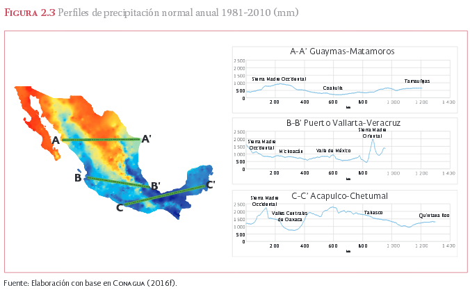 En la tabla 2.3 se observa por ejemplo que en la región hidrológico-administrativa XI Frontera Sur, que recibe mayor cantidad de lluvia, la precipitación pluvial normal anual 1981-2010 fue 11 veces mayor que en la región hidrológico-administrativa I Península de Baja California, la más seca. Esta variación regional de la precipitación normal es evidente en la figura 2.3 y en la figura 2.4.Para ilustrar la variación regional de la lluvia, la figura 2.3 tiene tres líneas de corte que permiten ilustrar los perfiles de precipitación normal Guaymas-Matamoros (A-A’), Puerto Vallarta-Veracruz (B-B’) y Acapulco-Chetumal (C-C’). Las gráficas muestran en azul el perfil de la variación de la precipitación pluvial normal en el periodo 1981-2010 a lo largo de las líneas de corte.
