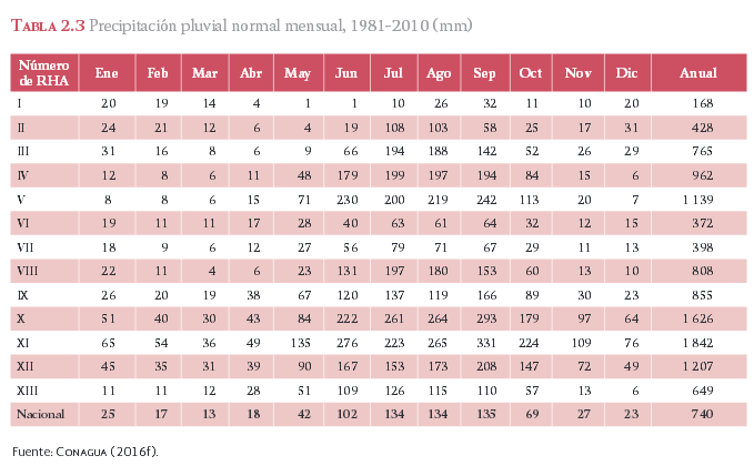 La tabla 2.3 presenta la precipitación normal por RHA en el periodo de 1981-2010, (consultar por entidad federativa en [Adicional: Tabla 2.A]).
